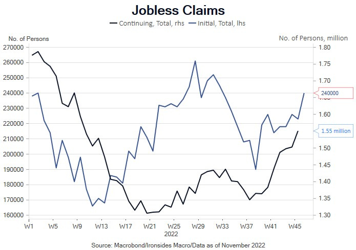 Seasonality, additional evidence of labor market softening that could turn a slowdown in the pace of rate hikes into a pause in 1Q23 and confirmation that while there were differing views within the FOMC on how far they needed to hike rates to reach a sufficiently restrictive level, there was broad agreement that the pace of hikes needed to slow, led to a push above 4000 for the S&P 500 and below 3.75% for 10-year Treasuries. With the various sufficiently restrictive views on the FOMC, next week’s speech from Chairman Powell on Wednesday, and to a lesser extent, New York Fed President Williams’ speech to the NY Economics Club on Monday, should shed light on whether the Committee is data dependent or on autopilot to a 5% policy rate. Though the Committee has been singing from the same hymnal on the weighting between their dual mandate, we’ve observed inclusive employment creeping back into the list of risks cited in some speeches. Our expectation is that though the summary of economic projections in September forecast for the unemployment rate was an increase to 4.4% in 2023 and 2024, an increase to 4% is likely to trigger a push for a pause from the inclusive employment faction. Though we suspect most of the focus will be on Ebenezer Powell’s speech, labor market data will be front and center next week. We’ve been pointing to continuing claims as evidence of increasing labor slack due to a reduction in demand. In the week ended November 12, the establishment survey week for the November employment report due Friday, continuing claims totaled 1.551 million, the sixth consecutive increase from 1.346 million during the September survey week. Initial claims are on the rise as well; in the week ended November 19 there were 240,000, well above expectations of 225,000, and 50,000 above the September low.