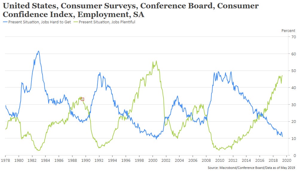 One quick note on yesterday’s the employment component of the May Conference Board Consumer Confidence report. The percent of survey respondents who described ‘jobs as hard to get’ fell to the cycle low and those who said ‘jobs are plentiful’ increased to a cycle high. Both levels were better than the peak of the labor market in the ‘00s expansion, close to the best ever levels at the end of the ‘90s business cycle. The improvement implies labor dynamism improved in May, this is another good sign for productivity and non-inflationary growth.