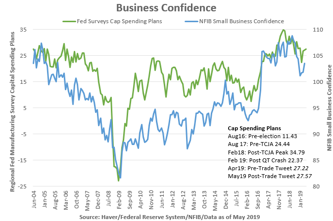 As we stare at a screen of red stock prices due to trade policy concerns we wanted to pass along a couple of positive observations. The Richmond Fed’s May Manufacturing Survey was the last input into our capital spending plans model and we were surprised that capital spending plans continued to recover from the 4Q18 QT stock market crash. While it is likely that capital spending plans will weaken in coming months due to the administration’s trade policy, given that the equity market has been declining for the entire month of May, the ‘tariff tweet’ was on May 5th and there was no pattern of deterioration as through time in the five regional Fed surveys released from May 15 through May 29, the marginal uptick implies the business sector might be more sanguine about trade than the markets.