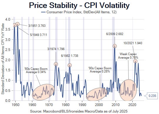 Another component of the FOMC’s flawed inflation framework is the 2% target. Their mandate is not 2%, it is stable prices, and they are meeting their objective. The median all items CPI rate since 1947 is 3%, the median standard deviation (volatility) of all items CPI is 0.58%. The current levels of 2.67% and 0.24% volatility exceed the objective of price stability. As our chart below shows, low inflation volatility (price stability) in the early ‘60s and the ‘90s were periods of strong capex and productivity growth. The third decade of relatively low inflation volatility, the ‘10s, did not see a capex boom. In our view a contributing factor to the weak capital investment in the ‘10s was misallocation of capital after the Fed launched their 2% target that led to excessive low real rates as the Fed attempted to increase inflation. The 2% target was enacted during a period of excessive obsession with policy efficacy at the zero lower bound, it was a mistake that led to malinvestment.