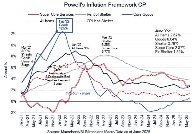 Treasury Secretary’s characterization of the FOMC being similar to someone who recently fell down, staring at their shoes, making them more likely to stumble again seems spot on. Our perspective is their fatal flaw is deeply rooted in the economic ideology of new-Keynesian economic thought. While most new-Keynesians will deny Milton Friedman was correct about anything, they appear to believe deeply that inflation is always and everywhere a monetary phenomenon. As one former Federal reserve director of research told us in 2019, the Great Moderation (80s, 90s, 00s and 10s) disinflation was virtually entirely attributable to Fed credibility. We couldn’t disagree more strenuously, the Great Inflation of the ‘70s and pandemic policy panic ‘20s inflation was always and everywhere, mostly a fiscal phenomenon. We appreciate why FOMC officials for political reasons do not want to discuss this publicly, but this blind spot appears to run far deeper. The week we learned federal government spending contracted 3.7% quarterly annualized in 2Q25, that followed a 4.6% decline in 1Q25, in 4Q24 it increased 4.0% and in the quarter before the election it increased 8.9%. Rather than sending households checks to boost growth like April ‘21 that was immediately followed by a spike in goods price inflation, government spending and employment are contracting. Disinflation is far and away the most probable outcome, the markets screamed that message in April and we agree.