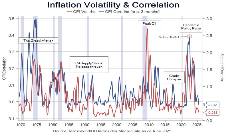 Today, government spending has slowed sharply, and the policy rate is restrictive for floating rate small business borrowers. Correlation of the components of the consumer price index has collapsed. The contrast between the macro policy in ‘21 when the government sent nearly $400 billion of checks to households with no strings attached, and ‘25 with the government enacting work requirements on transfer programs, could not be starker. The FOMC is looking for risk in all the wrong places, their Achilles Heel is the role of government spending in the inflation process, and they are venturing out onto thinner and thinner ice, except for Waller and Bowman.