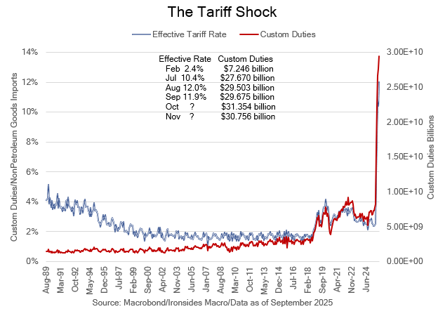 The second report, October trade, is important inasmuch as we are trying to determine the effective tariff rate and whether the massive goods deficit has stabilized or begun to contract in response to the increase in the effective tariff rate from 2.4% in February to 11.9% in September. As our first chart shows, custom duties have been relatively stable at $30 billion per month since August. One interesting development over the holiday period was the offshore yuan (CNH) rallying through 7, unlike round one of the US/China trade war the Chinese did not devalue their currency as an offset to increased tariffs. As we half listened to financial television over the holiday period, we heard lots of commentary about the Supreme Court IEEPA decision causing ‘volatility’ (a nonsensical characterization), although the legal ramifications of a ruling to uphold the Court for International Trade ruling could be significant, one way or another the tariffs are here to stay. What we haven’t heard much about is whether the Trump Administration’s tariffs will lead to a global trade restructuring, import substitution, manufacturing onshoring or just a net loss in economic efficiency.