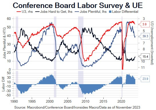 There are two major economic reports prior to the December FOMC meeting with the potential to close the gap between the September Summary of Economic Projections (SEP) YE24 policy rate forecast of 5.1% and market expectations of 4.04%. First up is Friday’s November employment report, followed by November CPI due on the 12th, the first day of the meeting. We were scratching our head following the September SEP forecast for a modest uptick in the Core PCED to 3.7% in 4Q23, though we thought their YE24 forecast of 2.6% is reasonable. Core PCED cooling to 3.5% in November along with the October CPI report, as well as tertiary and anecdotal data like the Beige Book appears to have convinced the Committee to remove the final 25bp from their forecast. However, the YE24 2.6% forecast still looks reasonable to us, consequently, to close the 1% gap between the FOMC’s YE24 and current market pricing gap further, something in the FOMC’s forecast will have to give and the unemployment rate is the most likely candidate.