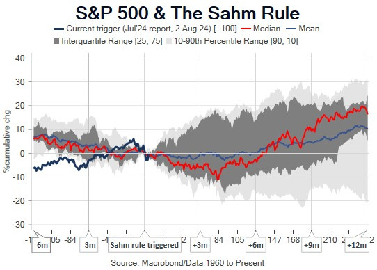 The most important questions we received this week was whether we should frame the growth scare equity market pullback in terms of time or price. A related question was the probability of a recession, which reframed as whether we get a double-dip earnings recession. The difference between a growth scare we suspect is worth 12%-14% off the S&P 500, and an NBER declared recession with a median drop of 24%, is nontrivial. For reasons we will explain in the note, we continue to lean towards the growth scare outcome, however the handful of post-FOMC appearances makes it clear the Committee does not appreciate the labor market negative convexity that is the real lesson of the Sahm Rule. In other words, once the U3 unemployment rate increases 0.5%, it is has always kept rising at least another 1.5%, thereby rendering the FOMC’s Summary of Economic Projections forecast a clear case of ‘it’s different this time’. Our base case for the macro-outlook is weak consumption data beginning next week, and weak labor market data beginning with the first estimate of the annual benchmark revision to the establishment survey just before the Jackson Hole Economic Policy Symposium, continuing with the August data either side of the Labor Day holiday. The catalyst for the equity market pullback was the deterioration in the economic outlook, consequently, with more weak data on the way, it strikes us as too early for the market to bottom.