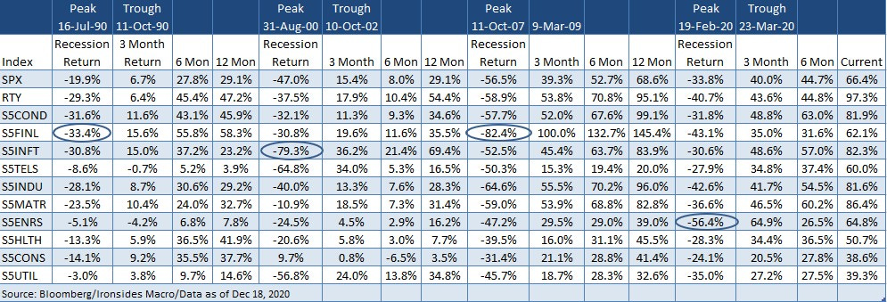 In the early stages of the recovery we recommended a Schumpeter’s Gale approach, in other words buy sectors where preexisting trends were accelerated by the pandemic including software and healthcare. By late April in The Corona Recovery Playbook, we recommended a traditional recovery sector bias; small caps, consumer discretionary, financials, technology and materials. Our underweights were defensive sectors; staples, utilities and REITs. In the summer we swapped industrials for consumer discretionary due to the condensed nature of this cycle and our view that the recovery in manufacturing and related inventory restocking would be exceptionally robust given that trade war and pandemic had depressed activity since mid-2018. Despite the market focus on work-from-home relative to reopening and growth vs. value, this cycle has followed the pattern of previous cycles. Most notably, in the first year of recoveries small cap average outperformance is 18% and though it hasn’t been a year, the Russell 2000 is 31% better than the S&P 500 from the March 23rd low.