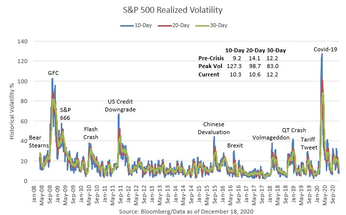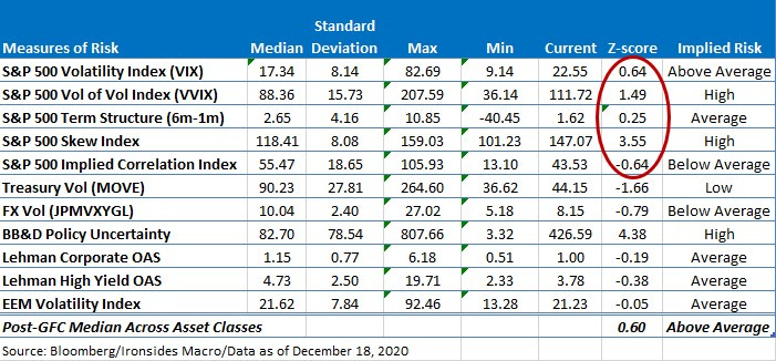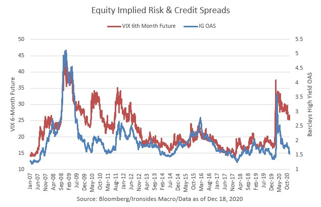 As the year draws to a close, markets are following typical seasonal patterns. Equities and commodities are rallying, Treasury yields are rising led by inflation expectations, credit spreads are tightening, and the dollar is falling against the Euro, commodity sensitive and emerging market currencies. This begs the question is sentiment sufficiently elevated to trigger a risk-off event. Generally, we view sentiment as a necessary but not sufficient condition for a correction. Given the tailwinds we covered in our 2021 Outlook, we suspect any pullbacks will prove transitory until we reach the point when the Fed is ready to normalize policy.