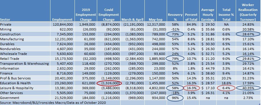 During the most acute phase of the crisis, the quest for real-time data focused on the sectors most impacted, leisure and hospitality, retailers and construction. Those sectors had been a focus of our work on labor market dynamism since Davis and Haltiwanger introduced their worker reallocation model at the 2014 Kansas City Fed Jackson Hole symposium. Turns out the sectors most impacted were the most dynamic, highest turnover sectors. They were also the target of the effective PPP program. In other words, these were the employers and employees most accustomed to chaos. That notwithstanding, waiting for the JOLTS report was not going to be of any use for investors during the pandemic. Instead, we created a back-to-work proxy using the cumulative increase in initial jobless claims less continuing claims. Initial claims measure job separations, the narrative that there were 30, 40, then 50 million newly unemployed even after continuing claims began to contract, omitted rehiring. This led us to a call ahead of the May employment report that hiring would turn positive by June and expectations for a 7.5 million decline were too pessimistic. Of course, that report was likely the largest positive economic surprise ever when jobs increased by 2.5 million. For investors, the recession ended on March 23rd, for economists (not econtants) it was over when the May employment report was released on June 5th. This pattern continued for subsequent employment reports. Seasonal adjustment factors skewed the weekly claims numbers negatively through the summer until the Bureau of Labor Statistics changed their methodology and throughout the pandemic market participants overestimated the impact of NPIs on aggregate economic activity as the 16% of total employment but only 6% of income from the leisure & hospitality sector never seemed to resonate with the econtants. One note on the unique psychology of the pandemic, in several cases following media appearances we received vitriolic feedback after bullish market outlooks. The combination of financial and health risks created perhaps the largest ‘wall of worry’ in our four decades in the markets.